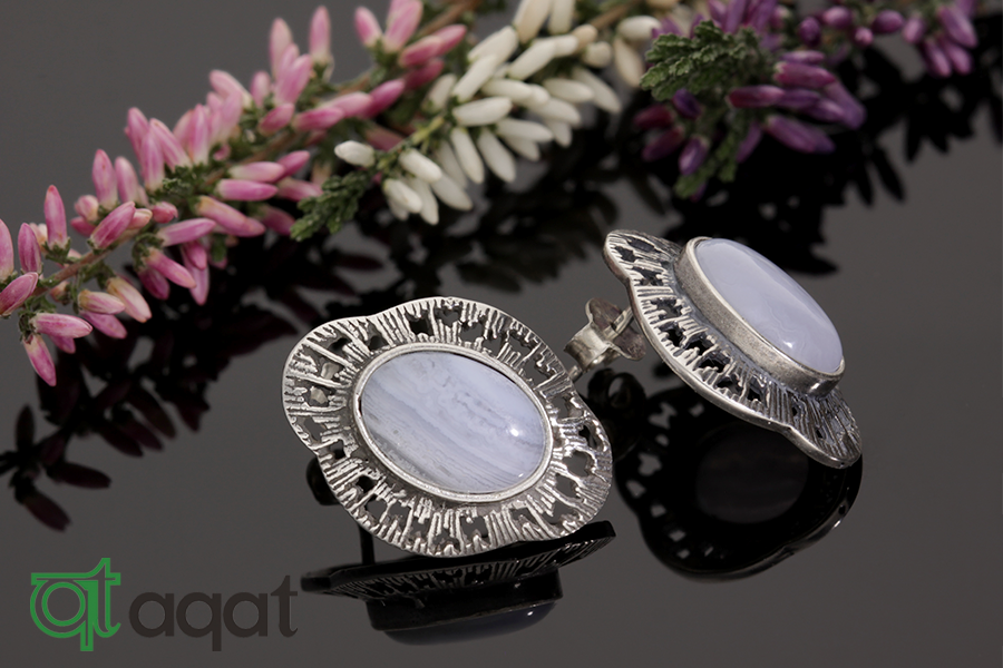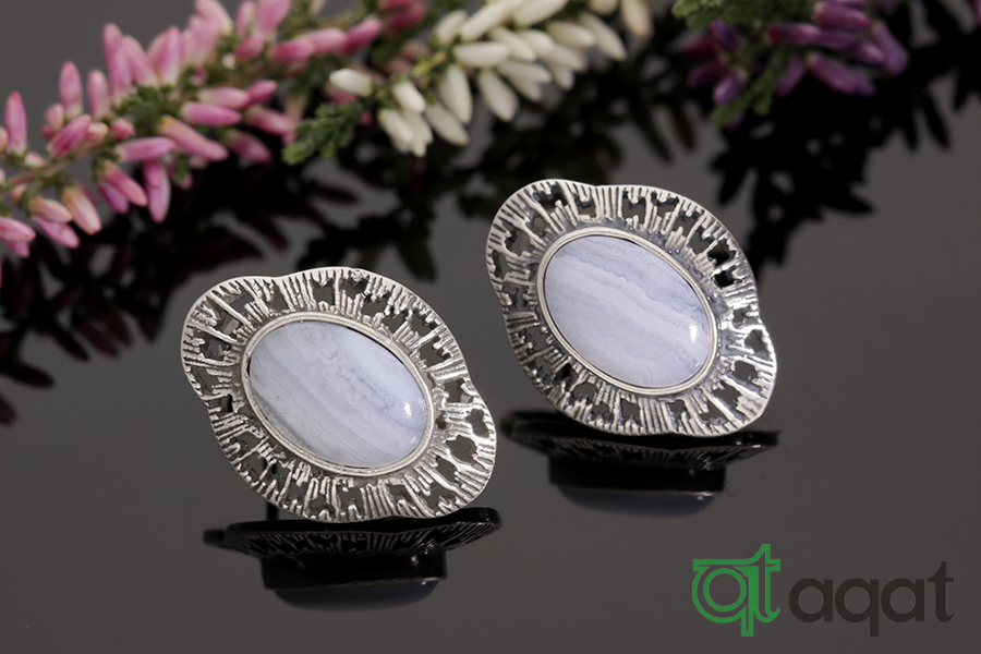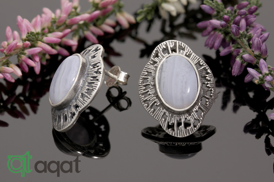 Kolczyki srebrne próby 925 z Agatem Blue Lace, oksydowane.