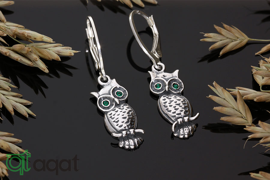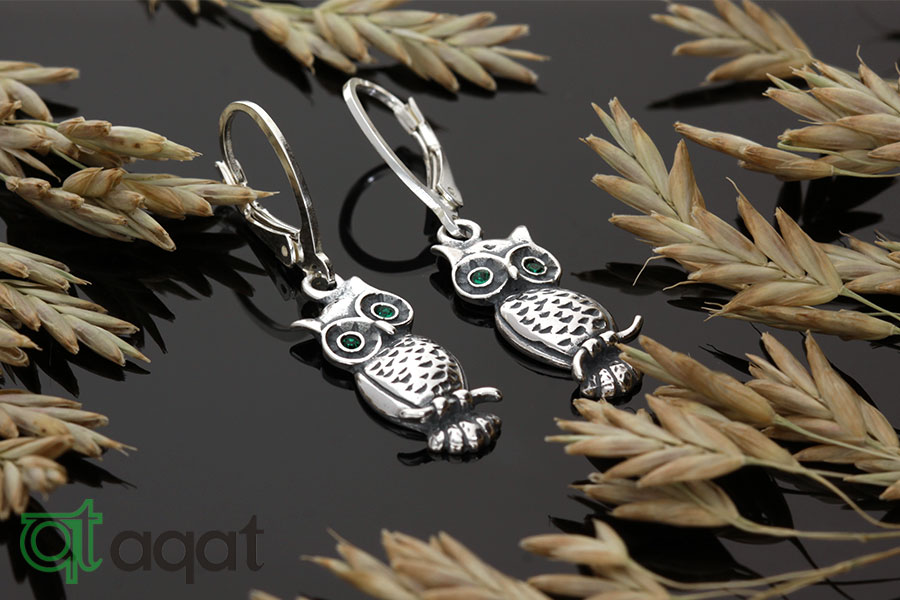 Kolczyki srebrne oksydowane, próby 925,  z motywem sowy z zielonymi cyrkoniami