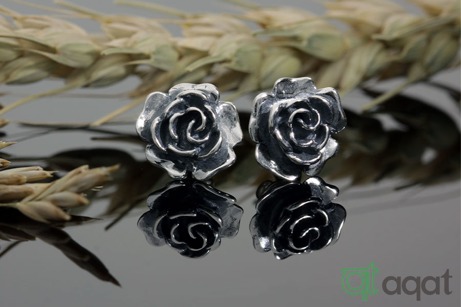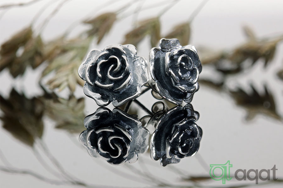 Kolczyki srebrne oksydowane, próby 925, na sztyft w kształcie klasycznego kwiatu róży.