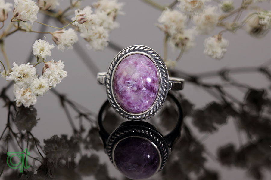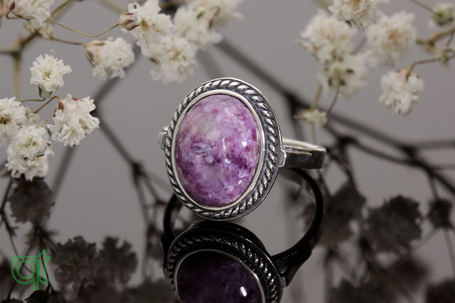 Pierścionek srebrny próby 925 z Czaroitem, oksydowany.
