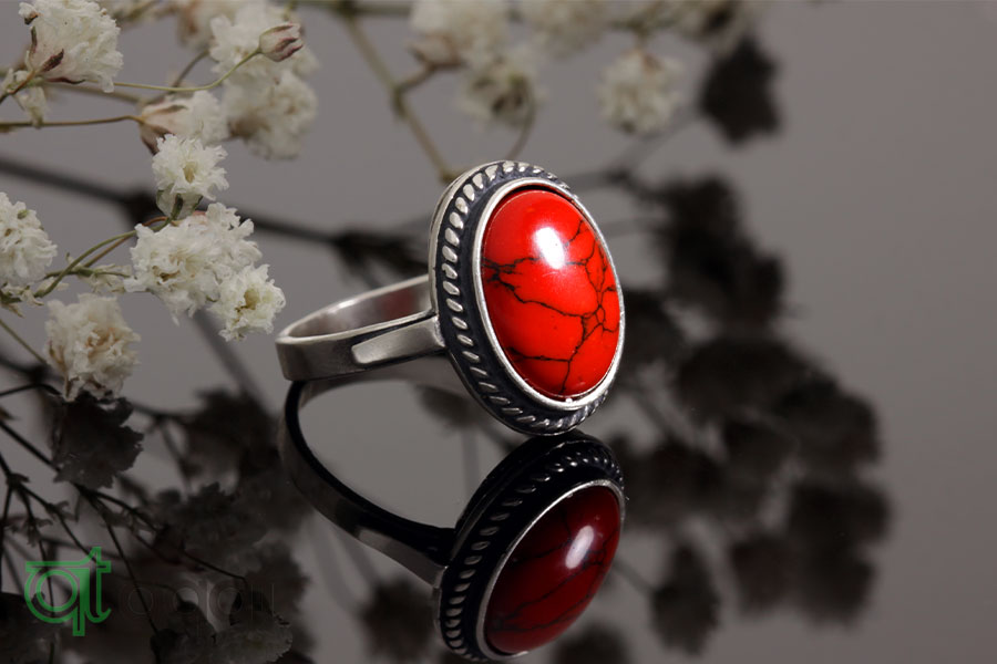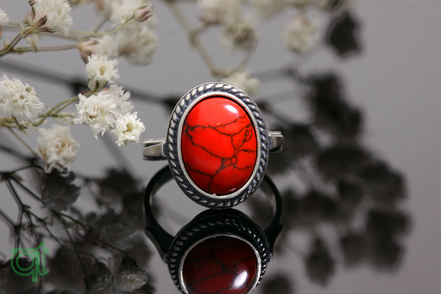 Pierścionek srebrny próby 925 z Koralem, oksydowany.