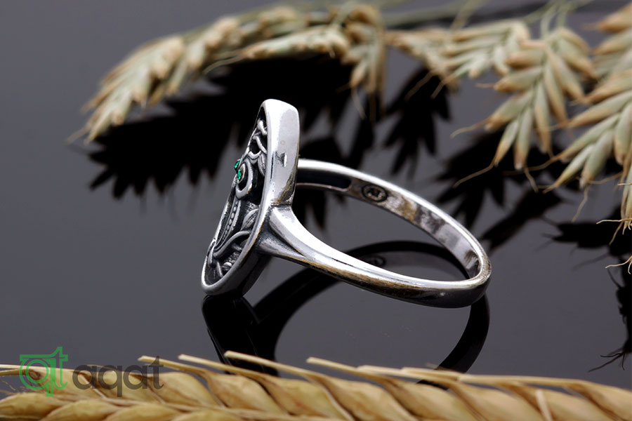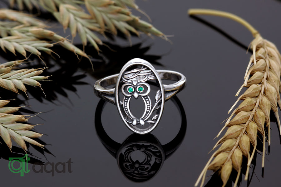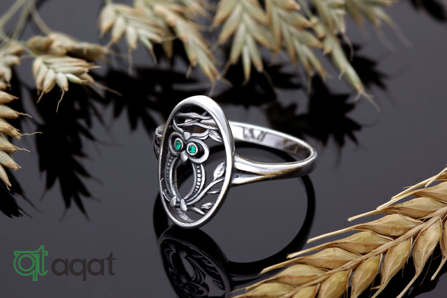 Pierścionek srebrny oksydowany, próby 925, z zielonymi cyrkoniami w sowich oczach.