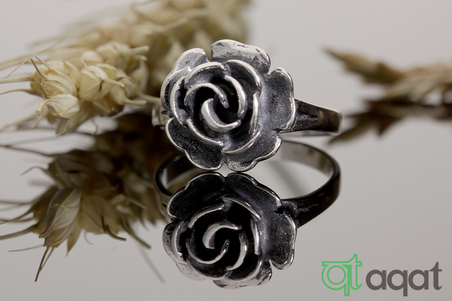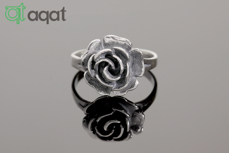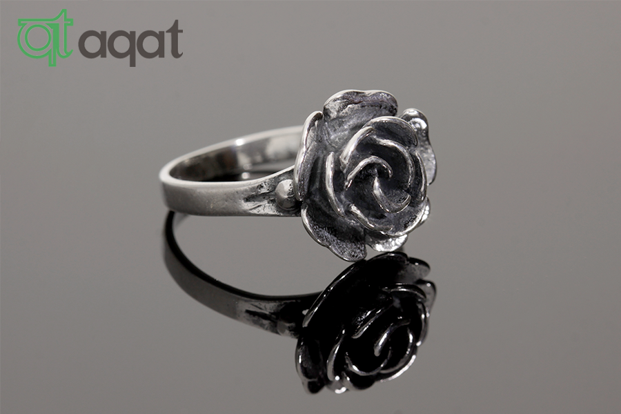 Pierścionek srebrny, oksydowany. Wzór kwiatu róży.