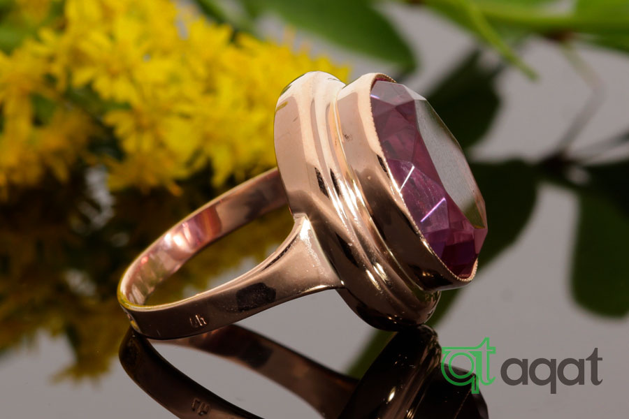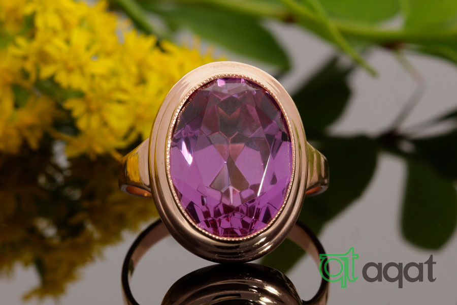 Pierścionek złoty próby 0,583 o masie 6,43gr. wykonany ręcznie. Rozmiar 14, Wymiary góry 19,59/15,40mm. Wymiary kamienia, ametystu 16/12mm