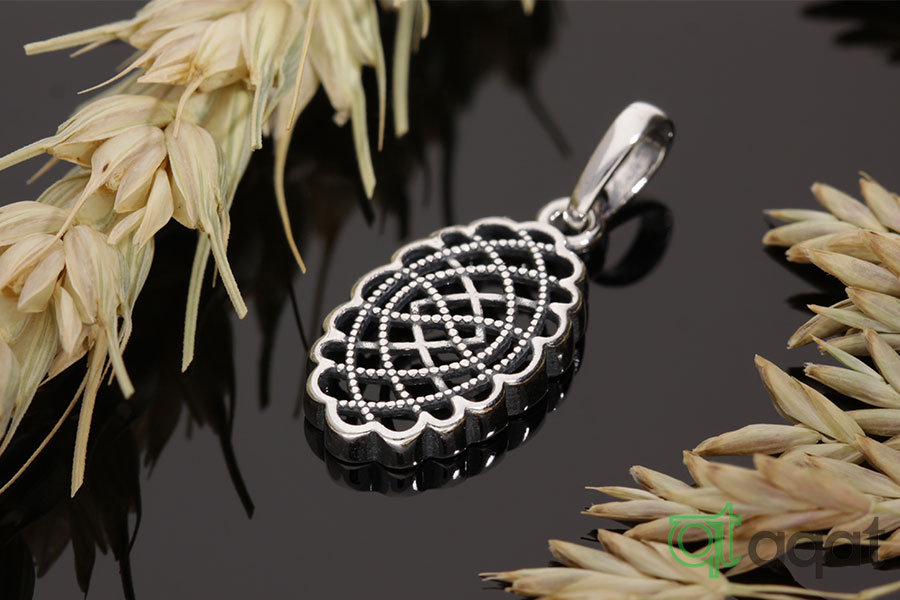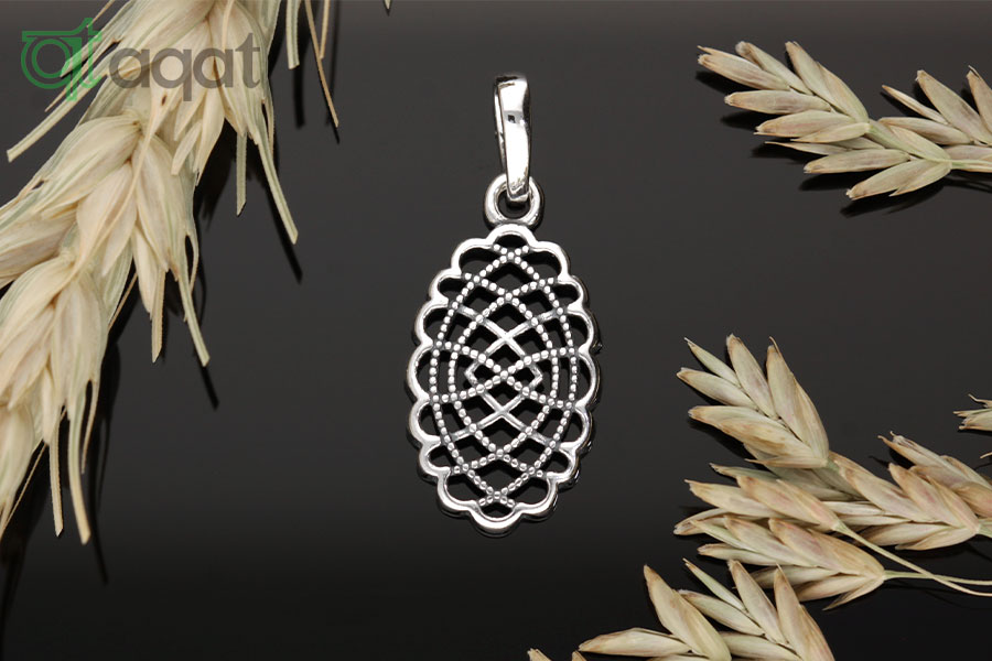 Wisiorek srebrny oksydowany, próby 925, owalny, otoczony falistym ażurem oraz wewnętrznym kratkowym wzorem.