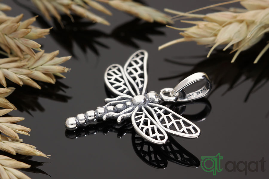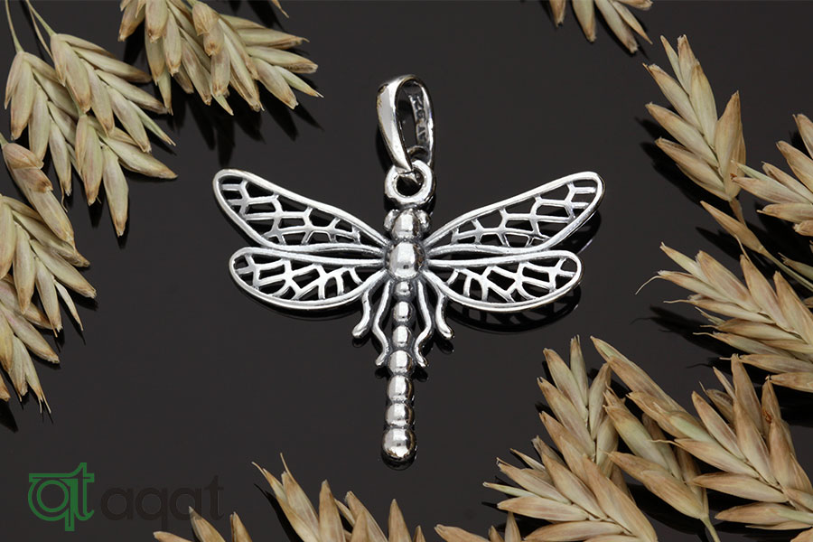 Wisiorek srebrny oksydowany, próby 925, uroczy i lekki w kształcie ażurowej ważki.