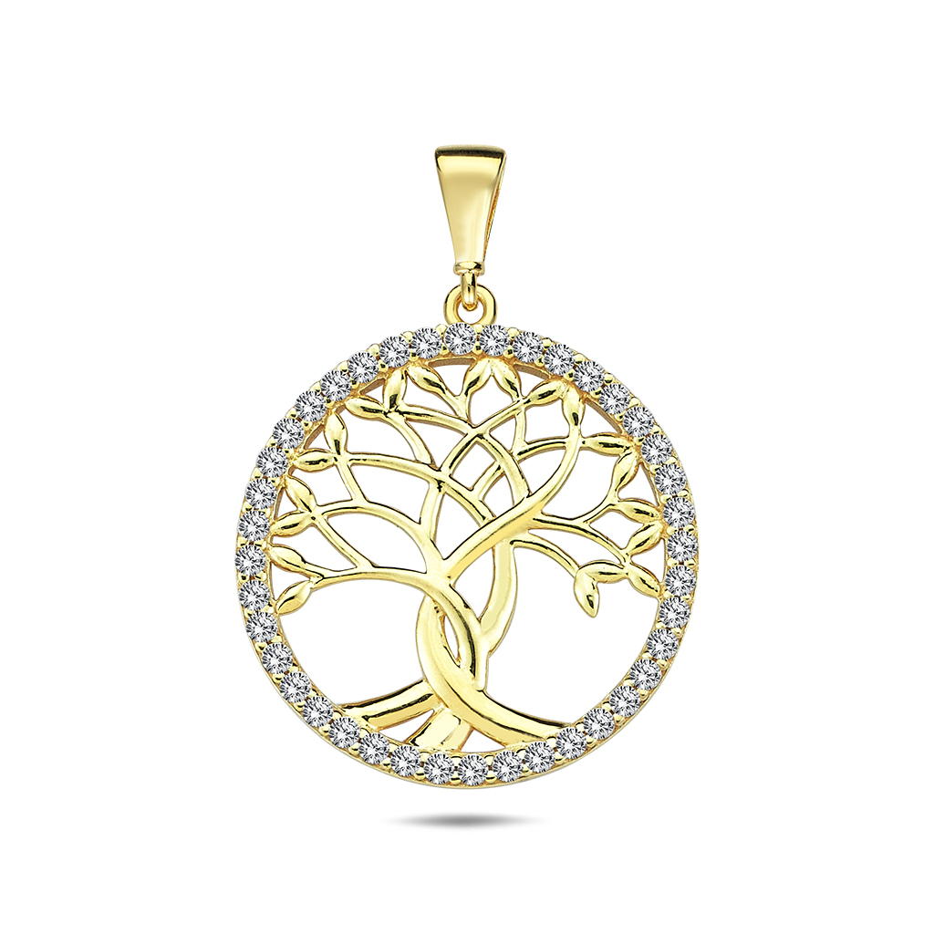 Wisior złoty, próba 585. Majestatyczne drzewo zamknięte w szerokiej ramie, gęsto wysadzanej lśniącymi cyrkoniami.